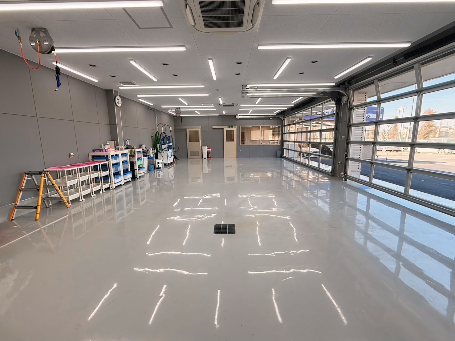 3台同時施工可能な、広く清潔な屋内洗車ブース。